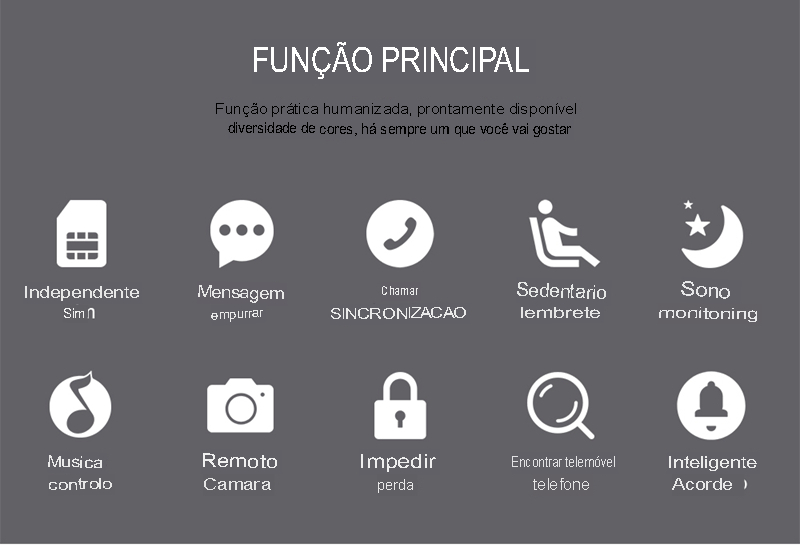 Visão geral: Discagem: atendimento mãos-livres, histórico de chamadas, lista telefônica, chamada Bluetooth SMS: SMS local, SMS do telefone móvel Bluetooth síncrono Entretenimento: reprodução local de MP3, reprodução de música Bluetooth Lembrete de chamada: lembrete de toque e vibração Exibição do relógio: 3 conjuntos de relógio de exibição, livre para alternar Anti-perda bidirecional: lembrete anti-perda, pesquisa bidirecional Pedômetro: passo esportivo, recorde de quilometragem esportiva Lembrete sedentário: atividades oportunas Monitoramento do sono: monitoramento da qualidade do sono Assistir foto: armazenamento na memória local Assistir remoto foto do telefone de controle: armazenamento no : programação sincronizável Idioma: padrão multilíngue inglês, chinês e inglês (requer requisitos de idioma, entre em contato com o atendimento ao cliente)Informações de envio de Bluetooth: Facebook, Twitter e outras informações oportunas, envio de SMS, notícias e outras informações do cliente